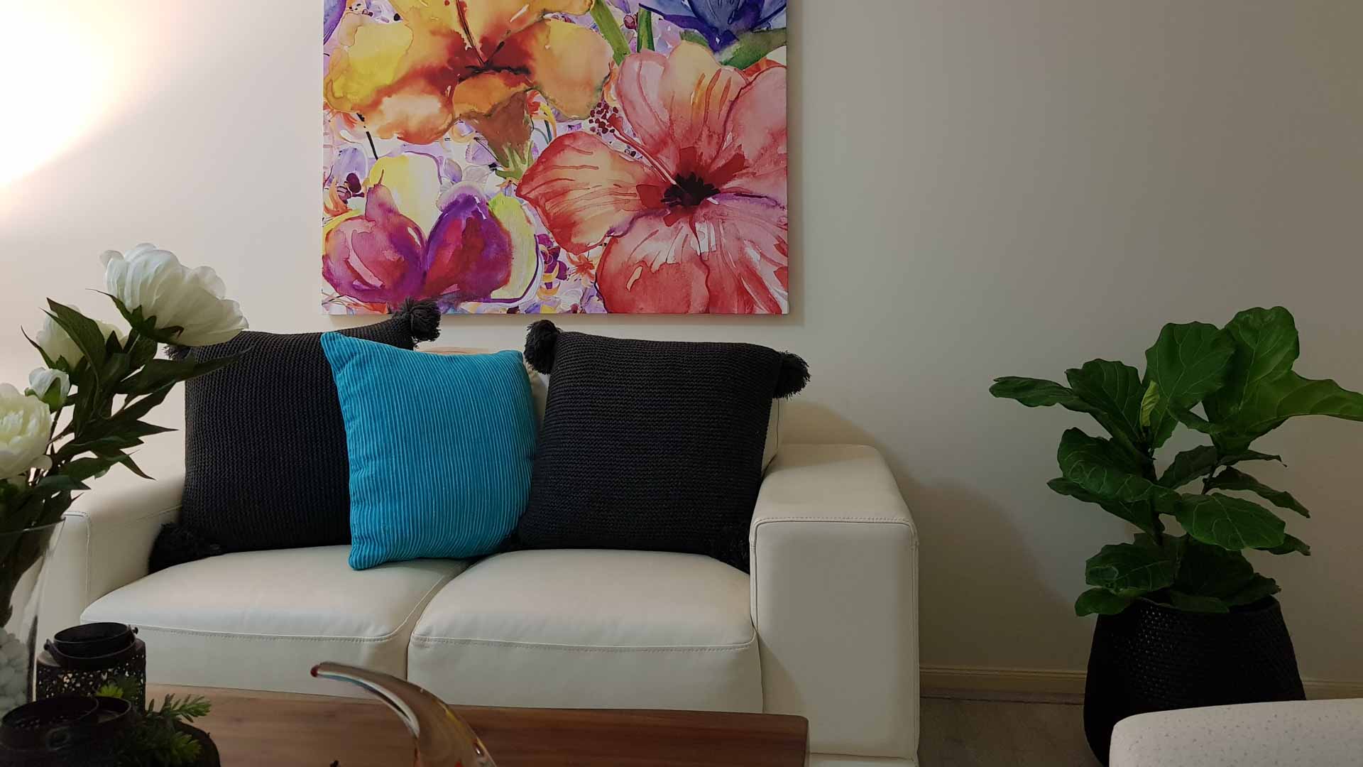 Unless you want a BIG colour splash, stick with safer neutrals for large furniture pieces and add your accent colours with your soft furnishings, kitchen glass splash back, artwork or a feature wall. Just make sure that two-thirds of your room is one main colour family (this is usually your neutrals).
